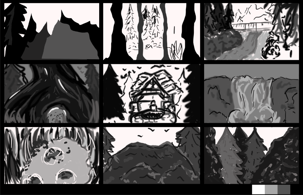 here are the nine thumbnails I did in this lesson, starting from the top left to the bottom right I progressively has less and less time and think it is quite clear to see my progress with creativity and more detail as they went on. this surprised me because I thought I wouldn’t work as well under time pressure but I think my later drawings are better than my earlier ones. I liked the fact we had a limited colour range only sticking with black white and greys.