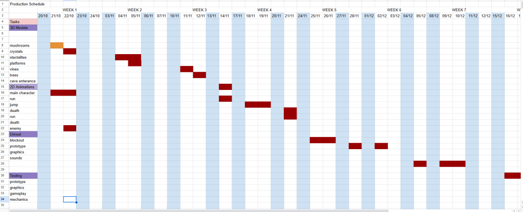 this is my schedule grant chart which is very slowly being worked on as i had some absences in my time at college meaning my work schedule isn’t as far forward as i would’ve liked it to be, i have began to animate my characters i think this is going well as i had missed some of the example lessons however in my free time i had as look at a few tutorials on how to use the software. i also began to model my 3d mushrooms.